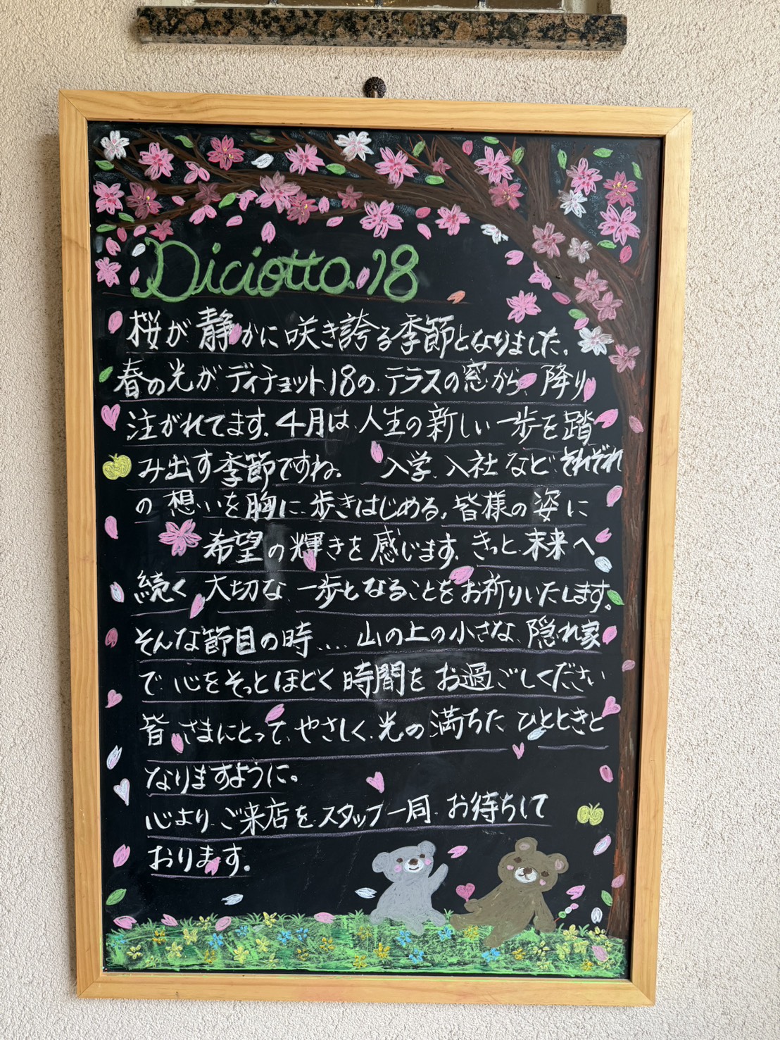 エンジェルナンバーではあなたの今までの努力が報われて、素晴らしい人生を授けてもらえるとか野球ではエースナンバーや歌舞伎では得意とした演目をおはこ(一八番)、1は一番とか8は末広がりなど、いい意味でも使われます。一か八かなんてのもありますけどね笑また、密かに人気な店舗前の黒板アートのメッセージも是非お楽しみください。